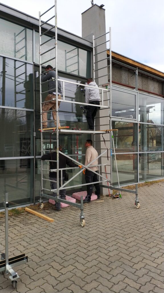 Tesla szalon függönyfalából hiányzó rész kipótlása, üvegcserék,üvegfóliázás.