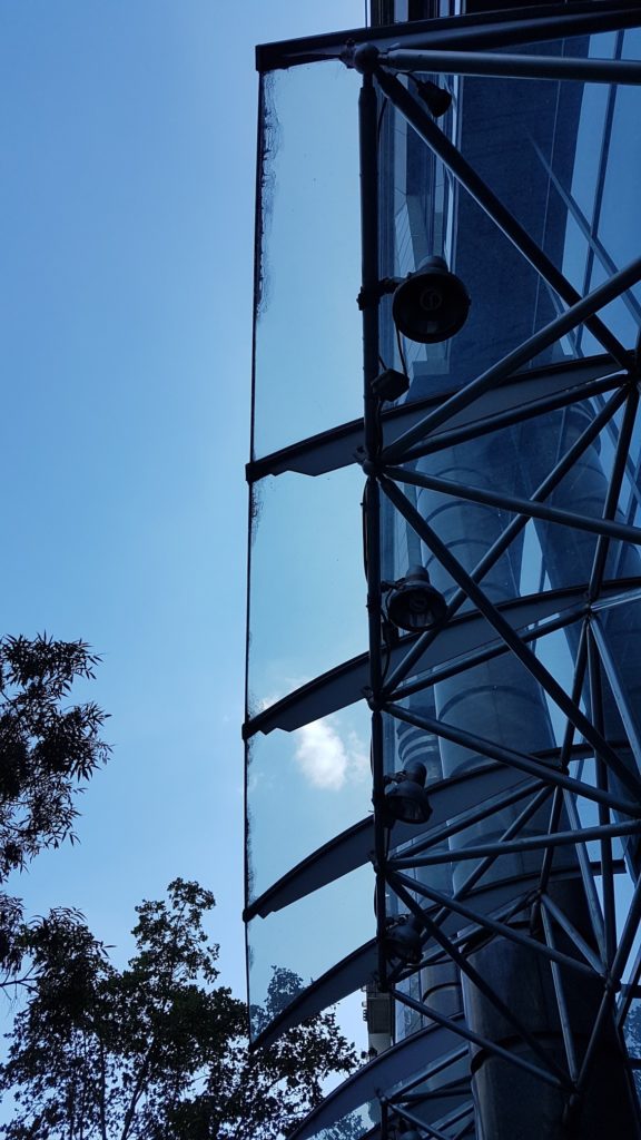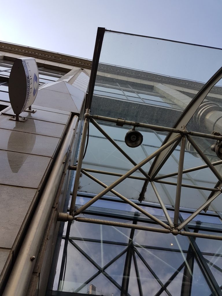 Atrinova irodaház hajlított üveg előtetőiben repedt, hajlított üvegek cseréje.
