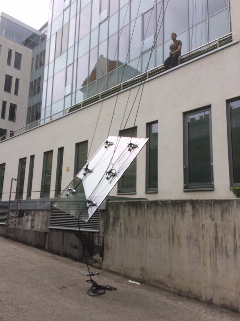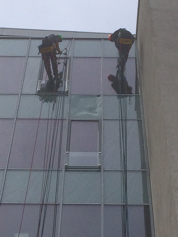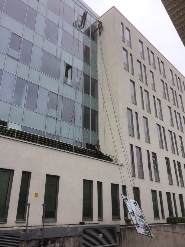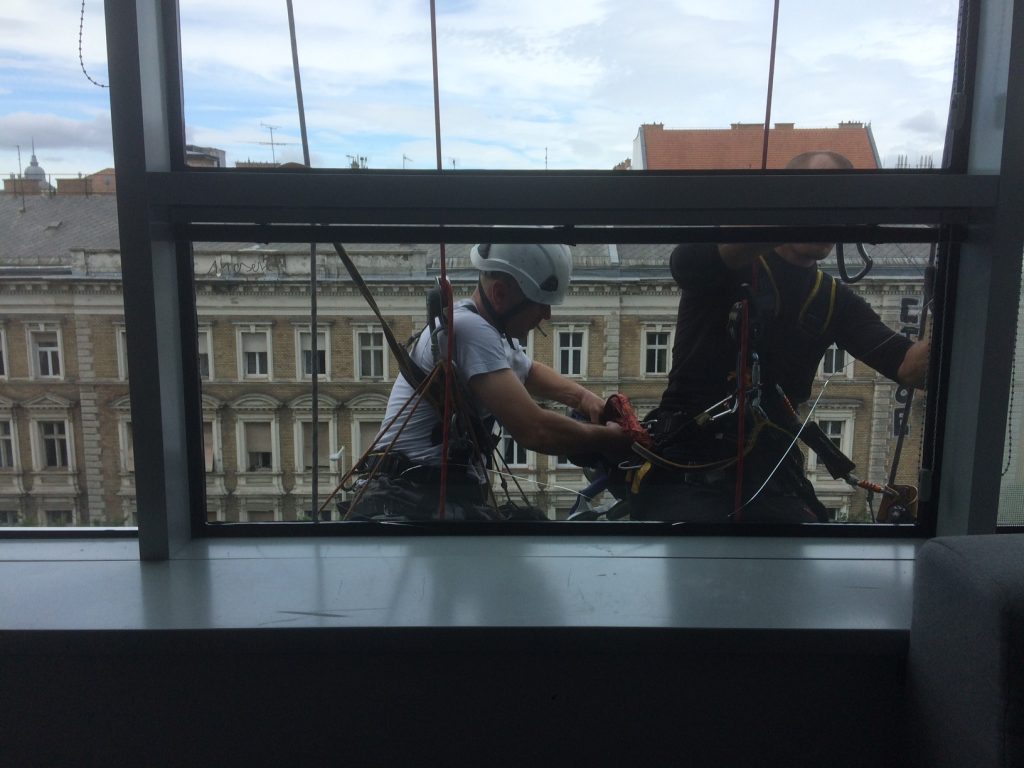 Üvegcserék az Eiffel Square irodaház több pontján állvánnyal és alpin technikával.